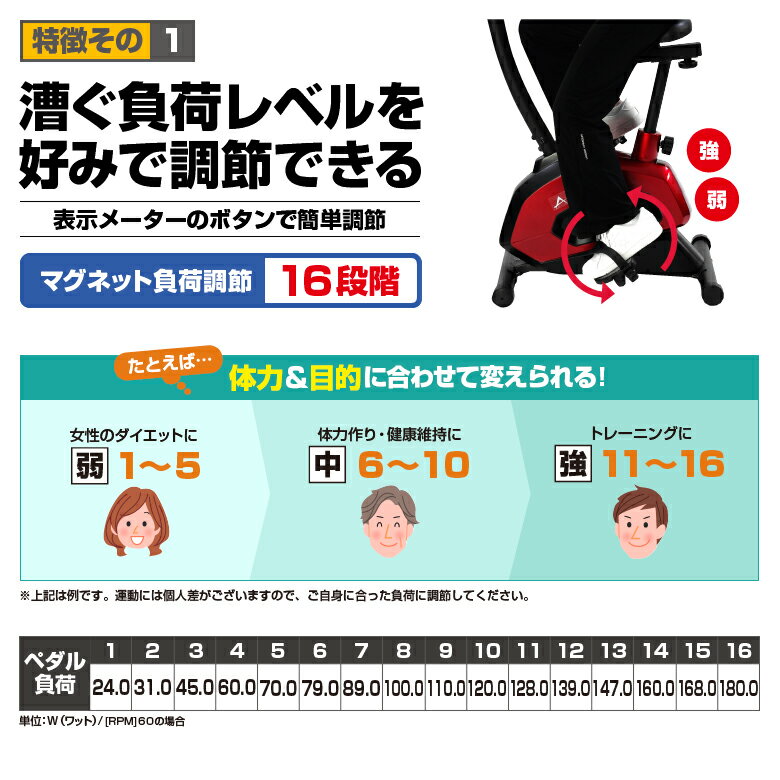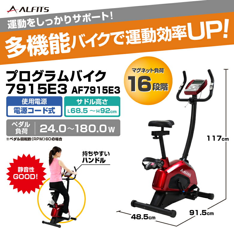 製品名 プログラムバイク7915E3 型番 AF7915E3 製品サイズ W485 × D915 × H1,170mm 梱包サイズ W230 × D820 × H580mm 重量 ■本体:約21.5kg■梱包:約24.5kg 材質 スチール/ABS/PVC/PU/PP 使用制限体重 90kg 連続使用時間 30分 JAN 4969182509120 メーカー保証 ご購入日より1年間 商品説明 ■ペダル負荷16段階(自動マグネット負荷方式)■パルスセンサー:グリップセンサー方式■電源:AC100V(50/60Hz)■定格消費電力:4.5W■トレーニングメニュー内蔵■心拍数・体脂肪測定可能■ペダルバンド付き■タブレットトレー付き■移動用キャスター付き 広告文責 アルインコ株式会社TEL:06-7636-2351 メーカー(製造)・輸入者名 アルインコ株式会社 区分 健康器具 生産国 中国
