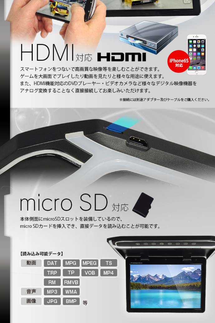 ●仕様 表示液晶:12.1インチ液晶 表示方式:NTSC/PAL 画素数:1280×800pixel 映像入力:HDMI/V1/V2 3系統入力 音声入力:HDMI 1系統入力 音声出力:1系統 対応ファイル形式:dat、mpg、mpeg、ts、trp、tp、vob、mp4、rm.、rmvb等 対応メディア:microSD、miniHDMI(Aタイプ) サイズ:約W340×H283×D30(mm) 重量:約1.8Kg カラー:ブラック ●セット内容 本体×1 接続ケーブル×1 リモコン×1 取付ステー×1 取付ネジ商品名 12.1インチ フリップダウンモニター MAXWIN(マックスウィン) 4580230183002 FLH1211B 商品説明 超薄型軽量 12.1インチのフリップダウンモニターです。