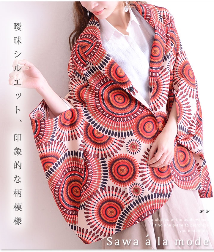 曖昧シルエット印象的な模様。トップス アウター ポンチョ ケープ 長袖 オレンジ orange 綿 春夏 レディースファッション ナチュラル otona kawaii フリーサイズ F Fサイズ M L LL Mサイズ Lサイズ LLサイズ サワアラモード sawa alamode カワイイ