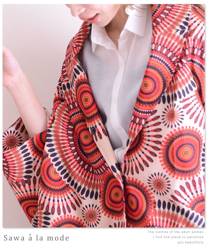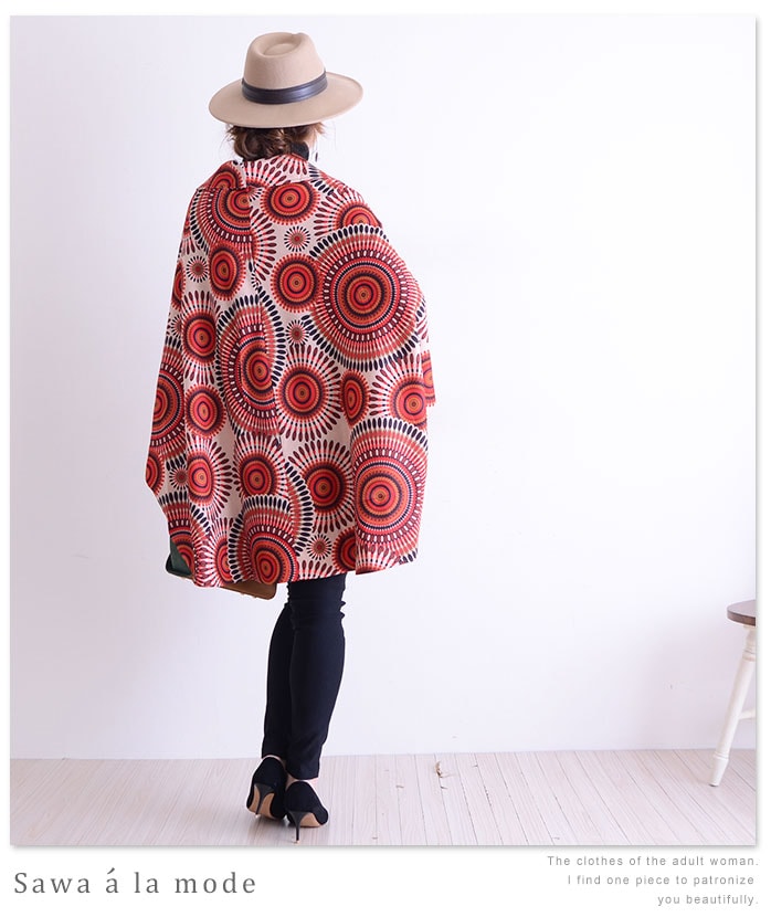 ポンチョ型のシルエットがふんわりと可愛く、鮮やかな柄と色が目を惹く、個性的なデザインです。